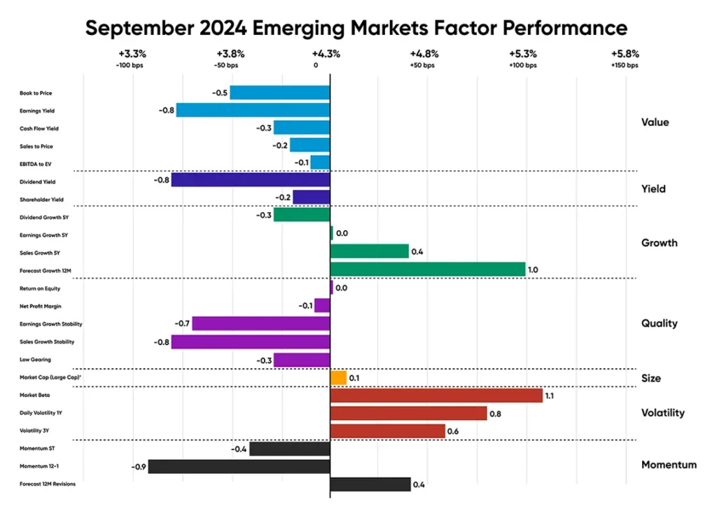 In September, the factor trend in Emerging Markets favored Growth and Volatility, with market performance surpassing that of its developed counterparts – the US, UK, and Europe. While nearly all Growth subfactors outperformed the market, leading to an average outperformance of 37bps, dividend growth 5Y was an exception, underperforming the market by 30bps. Equities with high volatility achieved the most robust performance in this region, resulting in an average total outperformance of 83 basis points. The quarterly performance of Emerging Markets was driven primarily by Growth and Volatility, while Momentum was a laggard with momentum 12-1, underperforming the market by 140bps. The Quality subfactors exhibited mixed performance in Q3 2024, with an average performance of 4bps.