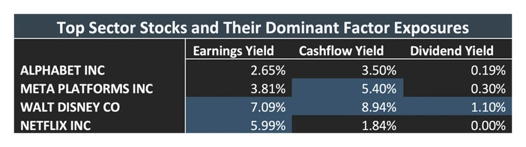 The communication services sector comprises leading, profitable companies with strong competitive moats and resilient earnings supported by factors such as digital advertising. These firms exhibit stable cash flows and consistent profitability. The Communication Services sector is primarily driven by Value and Dividend Yield factors, reflecting the characteristics of the companies that dominate this space. Many are mature, cash-generative businesses such as telecom operators and media firms, that may not grow as rapidly as tech peers but offer stable earnings and predictable cash flows.