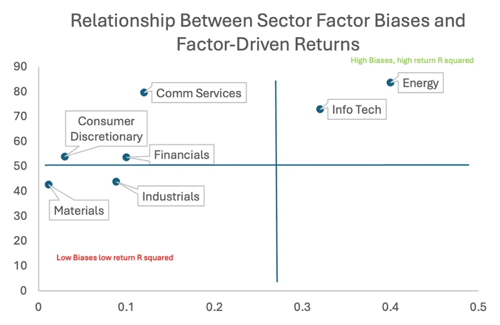 The chart below highlights notable differences across sectors in how factor biases translate into realized returns over the past five years. Info Tech and Energy stand out as the sectors where factor exposures, specifically Growth and Value, respectively, exhibit the strongest relationship with returns, as reflected by relatively higher R² values. In contrast, Consumer Discretionary, Financials, and Communication Services display pronounced factor biases toward Growth, Yield, and Value, respectively; however, the R² analysis suggests that these biases have had limited explanatory power for returns over the same period. This disconnect indicates that factors beyond their stated style tilts likely drove sector returns in these areas. Meanwhile, sectors such as Materials and Industrials show minimal factor bias overall, suggesting a more neutral factor profile with limited dependence on traditional style drivers.