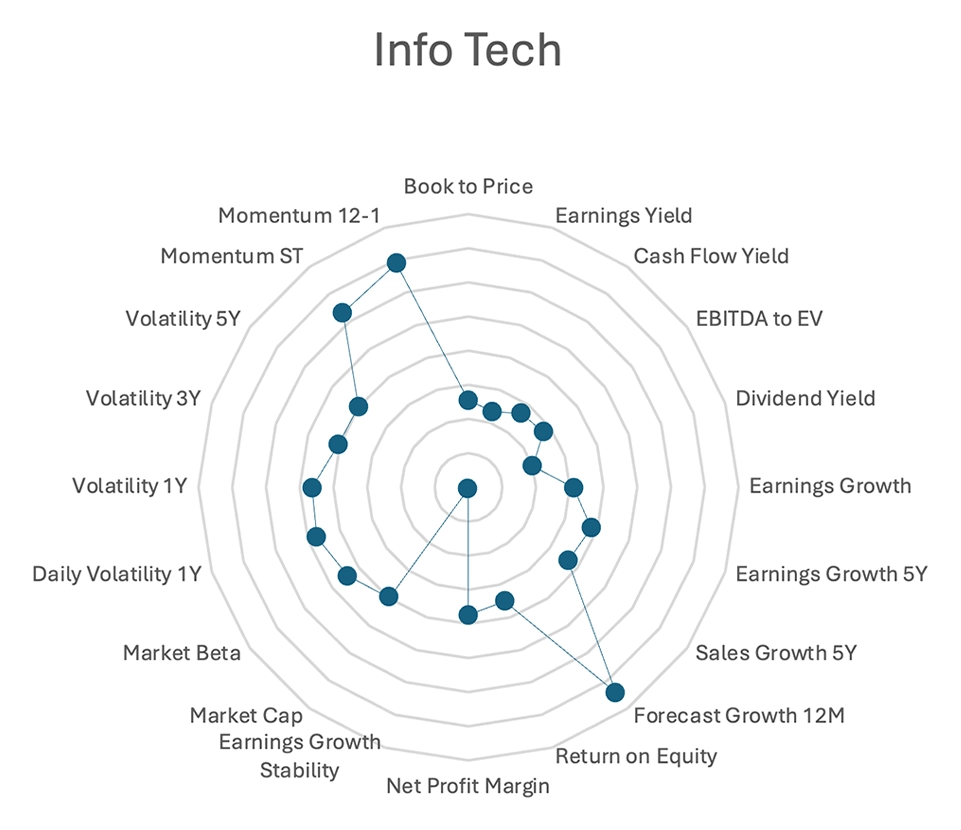 In December, Info Tech performance was primarily driven by strong 12-month forecast growth, short-term momentum, and momentum 12-1 relative to the broader US equity market. Investor confidence in Info Tech’s earnings outlook has been driven by sustained AI and cloud investment, resilient enterprise demand, and improving earnings visibility, which led analysts to revise forward estimates higher. Strong margin discipline and scalable business models among US mega-cap tech firms further reinforced expectations of durable growth relative to peers.