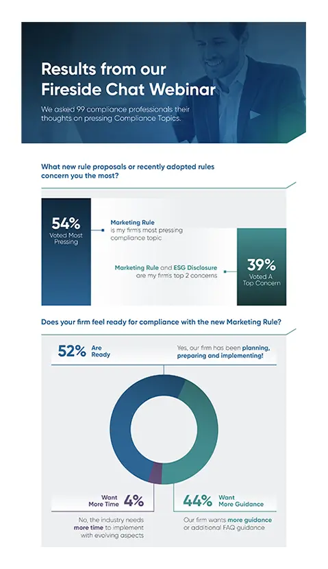 Looking back, the warning signs about exam focus in this area has surely been there all along. The long implementation date provided firms with 18 months to prepare for implementing the new rule, which involved complex overhaul of firm marketing content, disclosures and updating performance material. Based on a survey of firms attending our recent webinar in June, nearly 52% said their firm had been planning, preparing and implementing the rule and feel they are ready for an exam. Another 44% said they want more guidance (or additional FAQ guidance); with nearly 4% saying they need more time to fully implement.