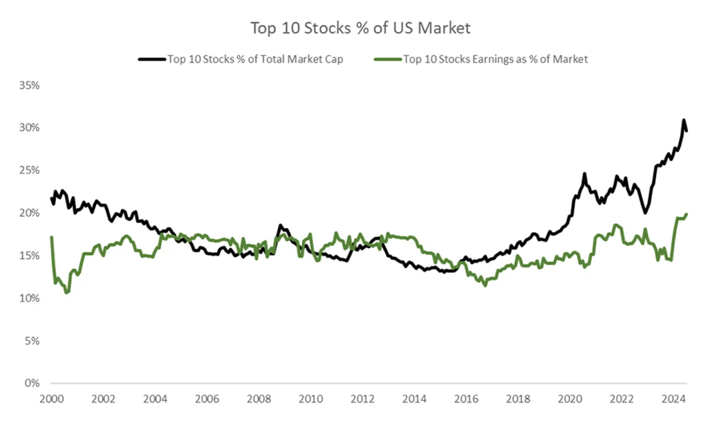 This is by far the highest level of concentration we’ve seen this century, far higher than the nearly 20% at the end of the Tech bubble. The top 10 stocks were only 20% of the US equity market, now they equate to nearly 30% (Exhibit 5). For most of the century, this cohort represented 12 – 17% of US profits, and likewise corresponded to roughly 15% of total US capitalization.
