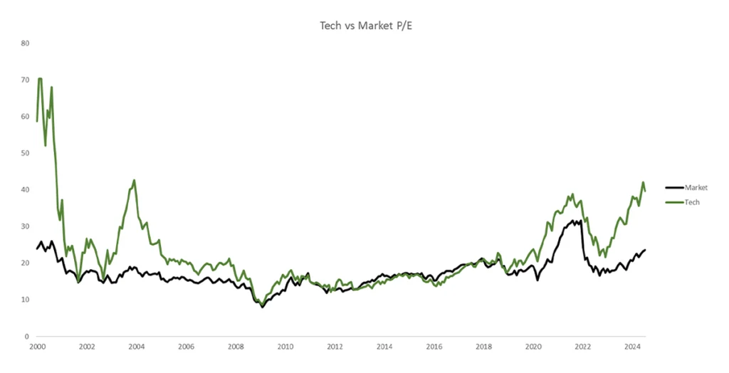 There are fundamentals backing up what appears to be distortions in the market but long term the mega caps can’t justify these valuations without AI. If we take Nvidia, for example, they’ve seen massive revenue growth, nearly 200% YoY (July 31, 2024). But this revenue is fueled by selling to other businesses. These other businesses include other mega caps like Microsoft, Meta, and Amazon, who are spending billions on Nvidia’s technology to build AI solutions. While there are commercial applications, the big money is being bet on consumers adopting AI, and then ultimately paying. We’re simply not there yet. The business models are unclear and the path to monetizing AI-driven consumer products is uncertain. It will likely happen, but that may take significant time. Paying a monthly subscription to a chatbot alone won’t get the market to the required billions in AI related revenue to justify these valuations in the next few years.