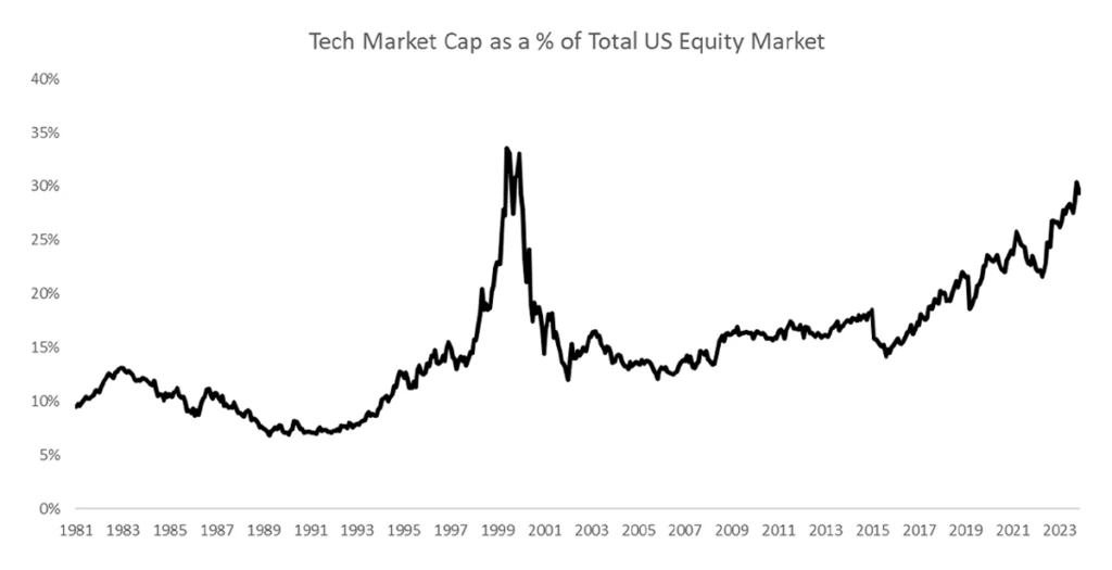 This leads to a key difference with today’s AI-fueled Tech boom: concentration. At least 8 of the largest 10 stocks in the US market have significant exposure to AI. In the 90s, there were seemingly countless Tech companies with billion-dollar valuations that had scarcely any revenue. Today, investors are getting exposure to AI through these mega caps. There simply aren’t many AI companies to publicly invest in that have the capacity to take on massive sums of AI-seeking capital. We examined the top 10 US stocks’ historical dominance to contextualize the current market distortion.