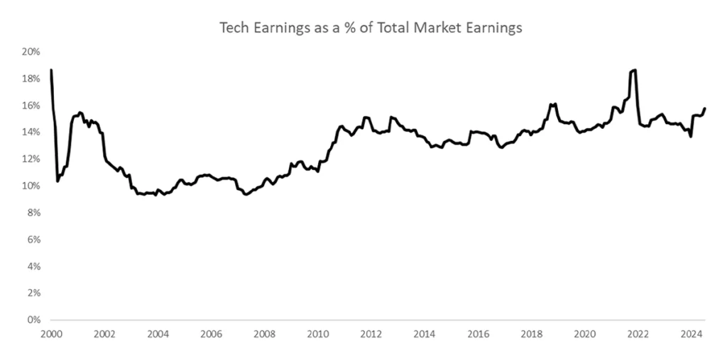As the Tech sector entered its long-term bull market in the mid-2010s, some began to question whether valuations were becoming excessive. While Tech companies crossed the 30% threshold of market capitalization, their share of total U.S. corporate profits was only 16%. This suggests that investors’ expectations of rapid growth, far outpacing the broader economy, and high earnings multiples, were fueling Tech’s dominance in the stock market.