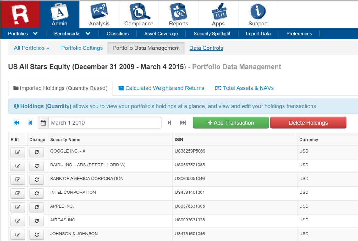 We now support market values based holdings data for portfolios. This provides additional flexibility alongside the existing quantity based holdings data and the security weights and returns option. You can also import your portfolio total assets independently to holdings. Total assets will be compared to the sum of the Market Value of the underlying holdings as part of the data reconciliation process. This new version also supports switching from your current data model to the new data model to preserve historical performance. Please contact your StatPro representative if you want to learn more about the new market values data model.