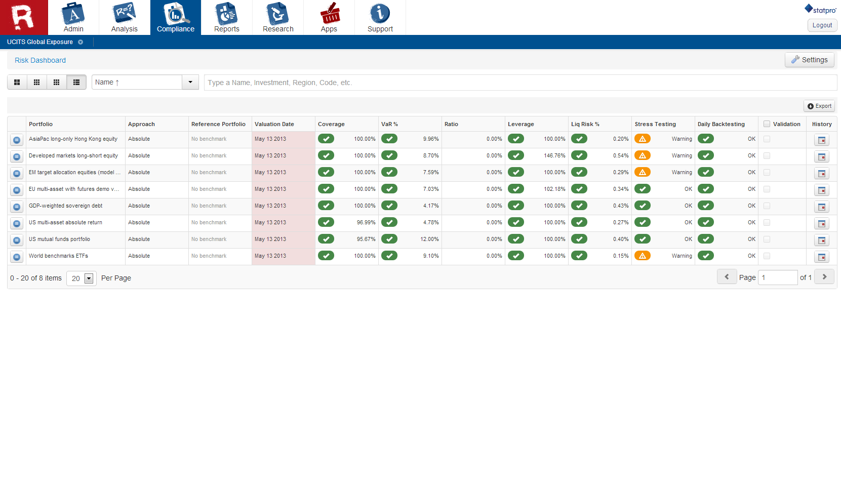 UCITS IV Global Exposure and Liquidity Monitoring module: allows you to oversee the risk and exposure of selected portfolios for compliance with the UCITS IV regulation. Limits can be set for monitoring and a traffic light approach is used to identify early warnings and breaches.