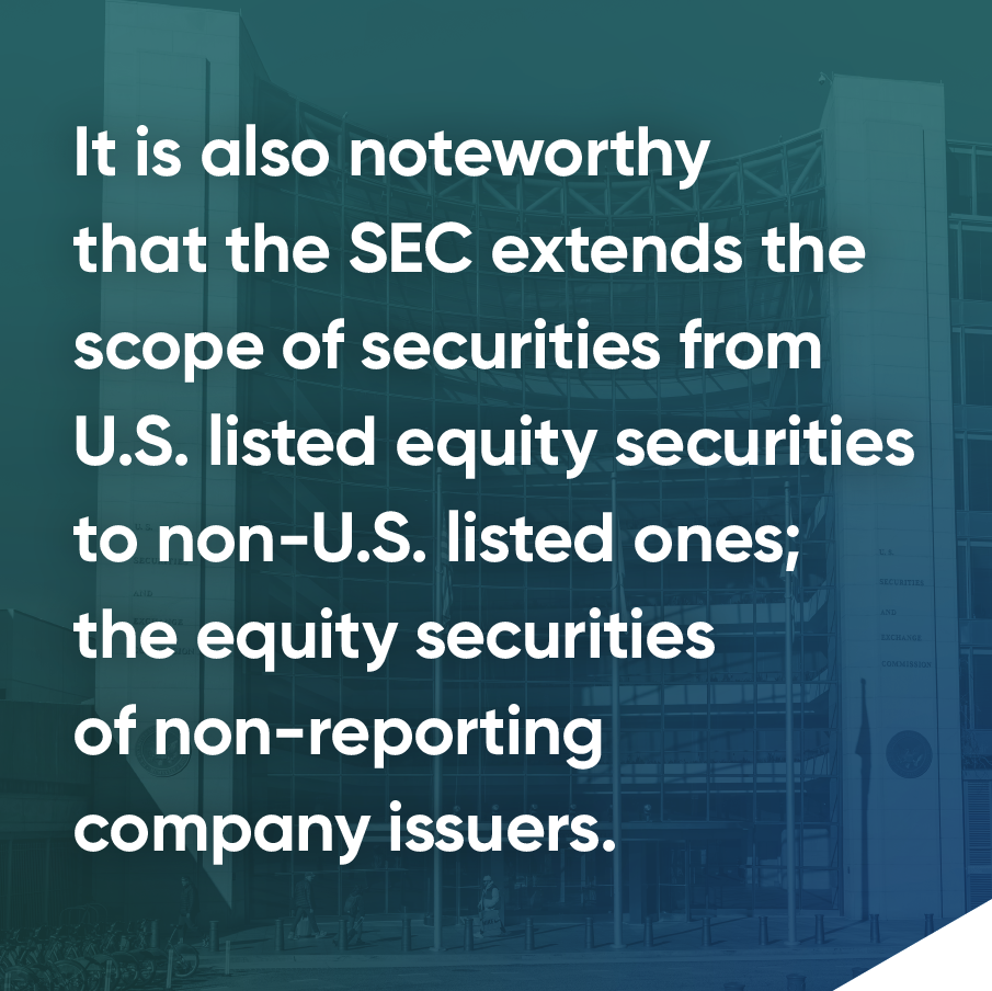 Rule 13f-2 covers the following types of securities that will be subject to short position disclosure: each class of exchange listed and over-the-counter (‘OTC’) securities, such as certain derivatives, options, warrants, other convertibles, and ETFs. It is also noteworthy that the SEC extends the scope of securities from U.S. listed equity securities to non-U.S. listed ones; the equity securities of non-reporting company issuers.