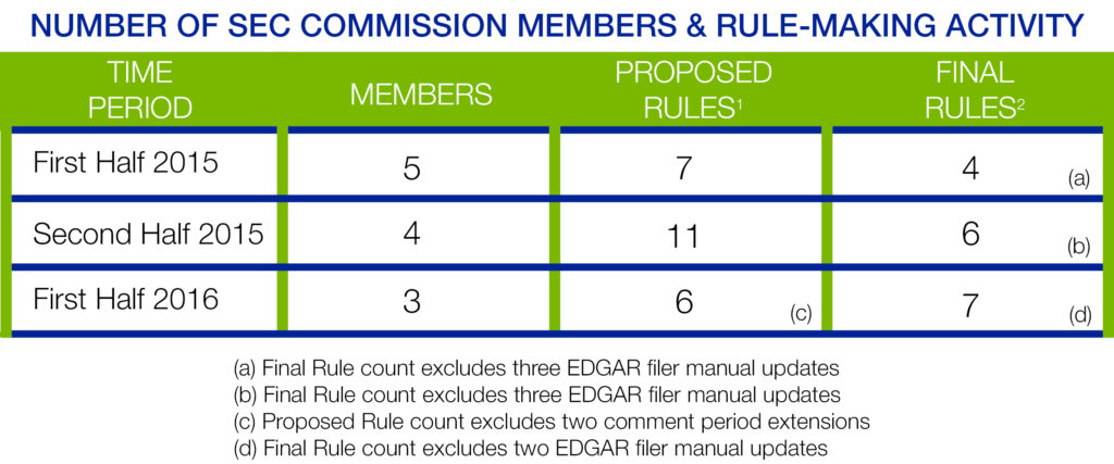 That is the theory, but how have things happened in practice? We have a pretty good comparison of how commission size has affected rule making since the Commission was at full strength in the first half of 2015, down to four in the second half, and down to three in the first half of 2016. Even adjusting for certain technical events like EDGAR Filer Manual updates and the extension of comment periods, there appears to be no let down in rule-making activity. As well, the rules proposed and finalized have significance. The four and three member Commission made such notable proposals as Liquidity Risk Management, Use of Derivatives and Advisor BCP, and finalized such notable rules as Crowdfunding and Titles V and VI of the JOBS Act.