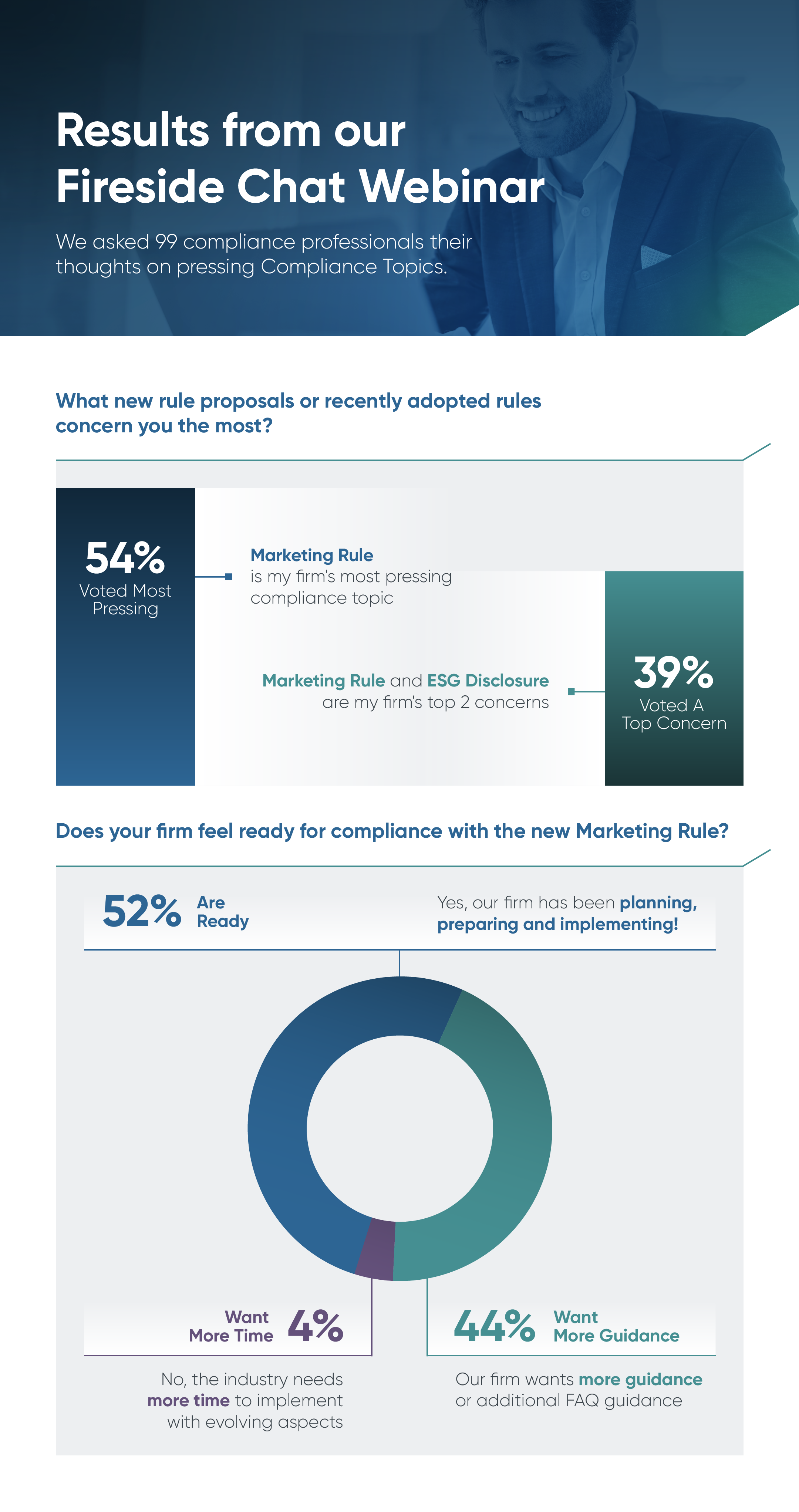 Looking back, the warning signs about exam focus in this area has surely been there all along. The long implementation date provided firms with 18 months to prepare for implementing the new rule, which involved complex overhaul of firm marketing content, disclosures and updating performance material. Based on a survey of firms attending our recent webinar in June, nearly 52% said their firm had been planning, preparing and implementing the rule and feel they are ready for an exam. Another 44% said they want more guidance (or additional FAQ guidance); with nearly 4% saying they need more time to fully implement.