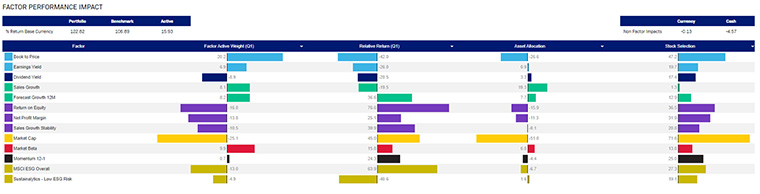 In this example, the featured Style Mine module enables factors to be used as a framework for understanding the source of active returns.