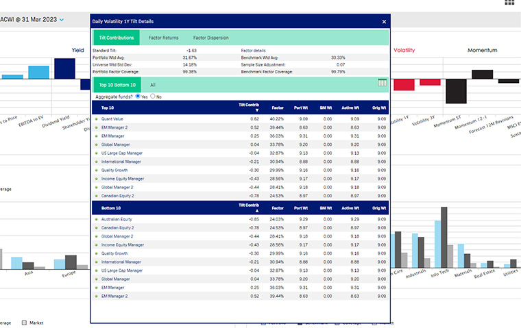 In this example using the latest set of holdings, you see the manager is currently biased toward Value and Volatility factors. You can identify if the manager is adhering to their stated investment style and meets your client’s mandate.
