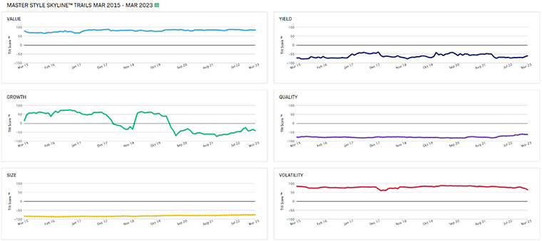 You can assess the historical Style exposure trends to uncover the manager’s consistency, or lack thereof, against category or individual factors. The Master Skyline methodology, aggregates factors into a simpler category score and measure changes over time.