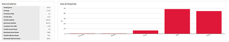 Using the latest holdings, you can then understand Fund risk by using the Style Analytics ex-ante risk model. You can identify traditional risk measures including tracking error, portfolio volatility and beta, etc.