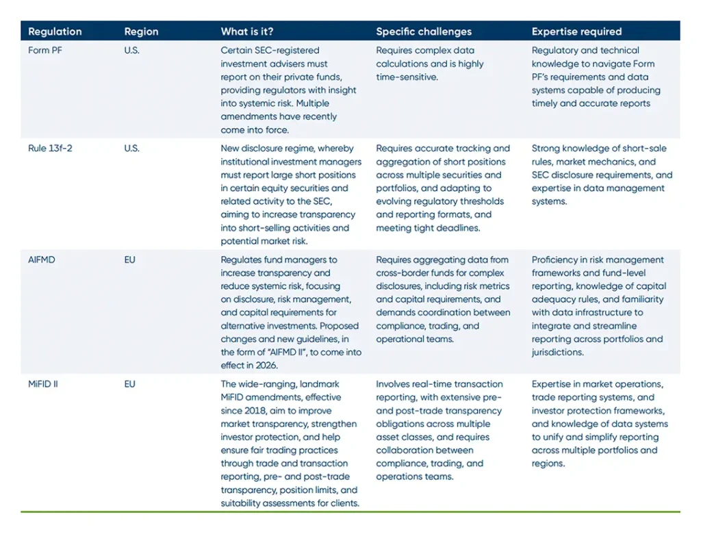 The regulatory landscape for asset managers has become increasingly complex in recent years due to evolving rules, heightened scrutiny, and global regulatory developments. In lockstep, regulatory reporting for asset managers has become increasingly complex, with mounting requirements and the need for advanced technological solutions to meet tighter compliance windows. Regulations like Form PF (under the Dodd-Frank Act) require private fund managers to report complex leverage, exposure, and liquidity data. Recent amendments have increased both the frequency of filings and the granularity of information required.